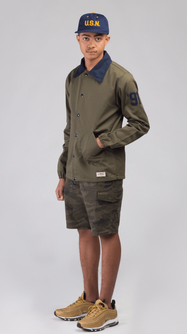 We chose the olive because we thought it was a good color for the spring. Then we wanted to think of a color that’d complement it for the neck, so we chose navy. We just tried different things that we’d like. Whenever we design, we think, “would we wear this shit?”